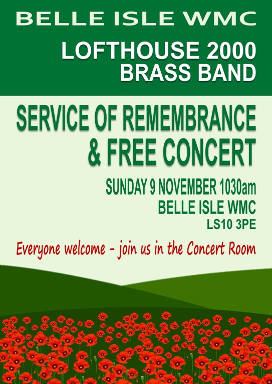 Belle Isle WMC Belle Isle Road, Leeds, West Yorkshire, United KingdomLofthouse 2000 Brass Band will be performing a Remembrance Service & Concert at Belle Isle WMC on Sunday 9th November from 10:30am. We will be paying our respects to the fallen with a wide set of music with links to the military and also some of our favourites. Entry is free and bar will be …